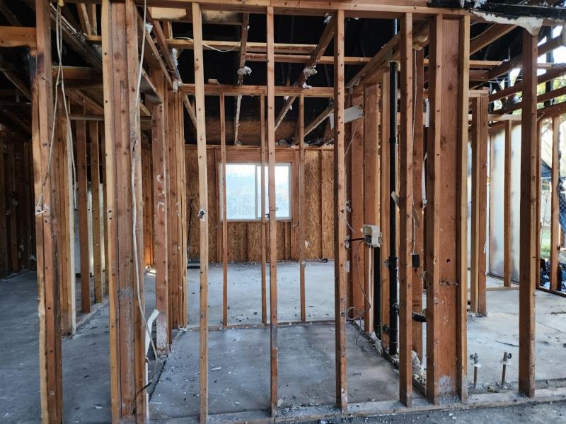• Full Interior Gut: Complete removal of interior finishes and damaged materials down to structural framing.